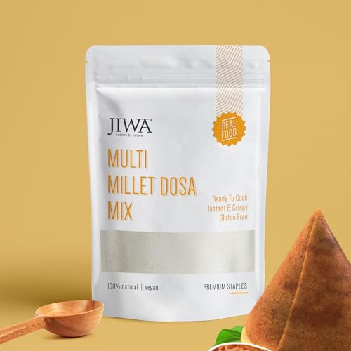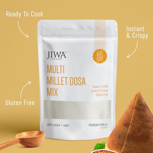 Looking for a healthy twist to a classic South Indian dish. Try Jiwa Multi Millet Dosa Mix. Made with Foxtail Millet, Buckwheat, Ragi & Barley, this dosa is delicious, easy to make and ready in just 10 minutes. A great way to include millets to your meal. Best before 6 months from date of manufacturing, fresher the better! Conventionally stored in tin boxes away from moisture and heat. Jiwa products are an innovative, value-added solution in the packaged food space. With us, make the shift to health with ease. Most food products today contain artificial chemicals, flavours, colours & enhancers. But not Jiwa. Everything about Jiwa is 100% Natural. We strive to inspire a healthy lifestyle through gluten free, organic & nutritious superfoods. Explore our range of millet & millet flours like Organic Jowari Atta, Organic Barley Flour on our brand store. All Jiwa products are processed in an ISO 22000 certified plant.
