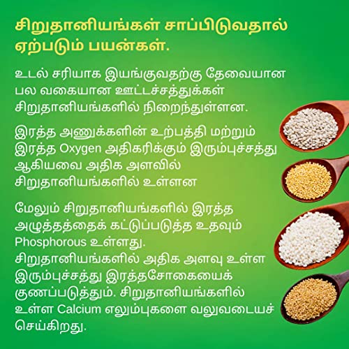 Try the crispy, golden brown dosa, with our all-natural, preservative-free batter mix by adding only grounded urad dhal. And enjoy a supernutritious meal everyday The best Dosas are made with the freshest ingredients. And that’s what we use with absolutely no added preservatives.The taste and texture is very similar to polished white dosas. Four kinds of millets in dosa batter powder. foxtail millet (thinai), little millet (saamai), kodo millet (varagu) & Banyard(Kuthuravali). Directions Soak 1/4Cup(500g) Urad dhal for 1hr or more and grind well by adding water little by little till fluffy and bubbles appear. Transfer the Grinded batter to a vessel Measure 1 cup(200g) millet dosa powder, add it to urad dhal batter along with salt. Mix it well with your hands and form a smooth lump free batter. Add water if required. ferment 6-8 hrs.The batter would be well raised in morning. serve crispy dosas Age recommendation: Suitable for all ages above 8 months