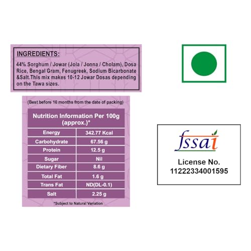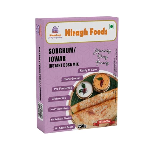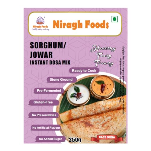 Relish the delicious nutrient-rich Crispy Jowar Dosas, along with Coconut / Tomato Chutney or Sambar. In Niragh Foods we prepare the dosa batter the traditional way, stone ground and fermented, then using proprietary technology we make dry powder with utmost care retaining the taste and nutrients of the batter using state-of-the-art modern machinery. All you have to do is add the amount of water mentioned on the pack and mix it without any lumps into a smooth consistency, in a few minutes you get batter which as good as a fresh batter with the right pH. So with Niragh Foods Dosa mix, you get the authentic taste as well as the goodness of Sorghum / Jowar along with Urad dal and other nutrient-rich grains. Known Benefits of Sorghum /Jowar (Jola /Jonna /Cholam) Known as Great Millet, Jowar is Gluten-free, which means good for gut health. – Sorghum contains 7.6 to 9.2 % of dietary fiber along with slow digestibility good for diabetics – Jowar is a complex carb, hence will not cause a spike in Blood Sugar levels, as the carb is slowly absorbed in the bloodstream – Has higher levels of protein – High in Magnesium, hence good for Bone Health – Full of Iron helps prevent anemia – Sorghum is a rich source of vitamin B-complex especially niacin (vitamin B6), thiamin, and riboflavin.