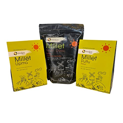 The Svojas Farms Healthy Millet Sorghum Millet Super Mixes are a convenient and nutritious way to enjoy a traditional Indian breakfast. This pack includes three breakfast mixes made of Sorghum millet: Upma, Nutri Dosa, and Puttu, providing a variety of flavors and health benefits. The Nutri Dosa mix is made from a blend of Sorghum millet and Legumes, providing a high-fiber and low-carb option. The Upma & Puttu mix is made from a single ingredient(sorghum millet), providing a gluten-free and vegan option. These mixes are free of preservatives and added colors, making them a healthy and natural choice. Try the Svojas Farms Healthy Millet Sorghum Millet Super Mixes for a delicious and nutritious breakfast.